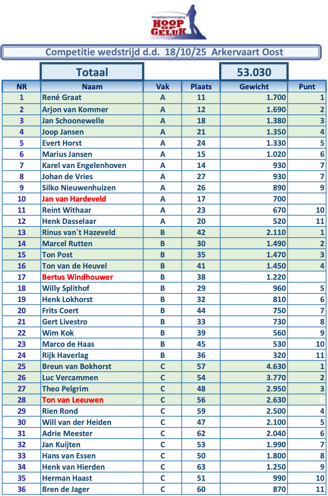 Het B vak werd gewonnen door Rinus van`t Hazeveld die 2110 gram wist te vangen. En in vak A was het René Graat die door het winnen v h A vak dicht bij het behalen van de titel komt. Zijn gewicht van 1700 gram was voldoende voor de winst.