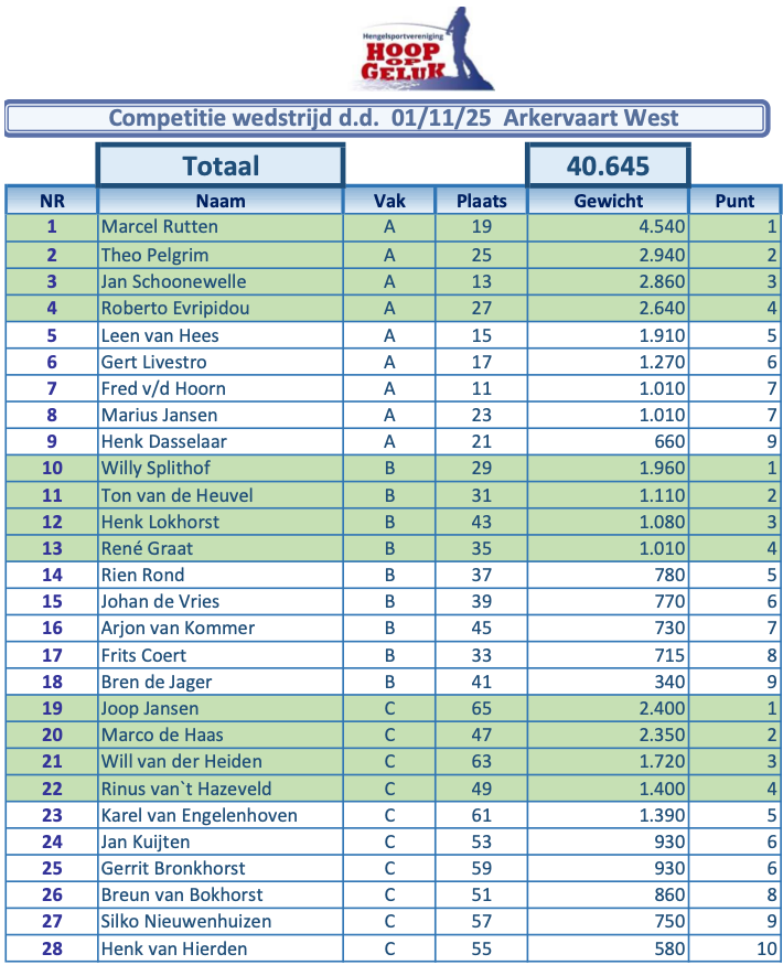 Afgelopen zaterdag 1 november werd de laatste en beslissende competitie wedstrijd aan de Westkant van de Arkervaart gevist.