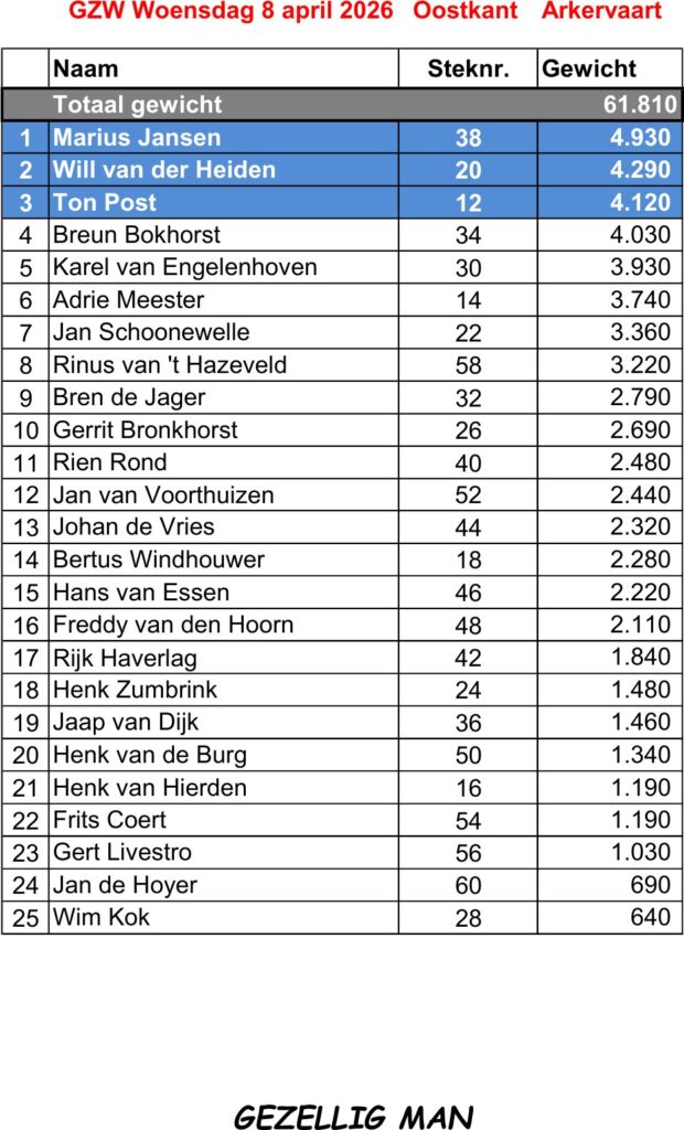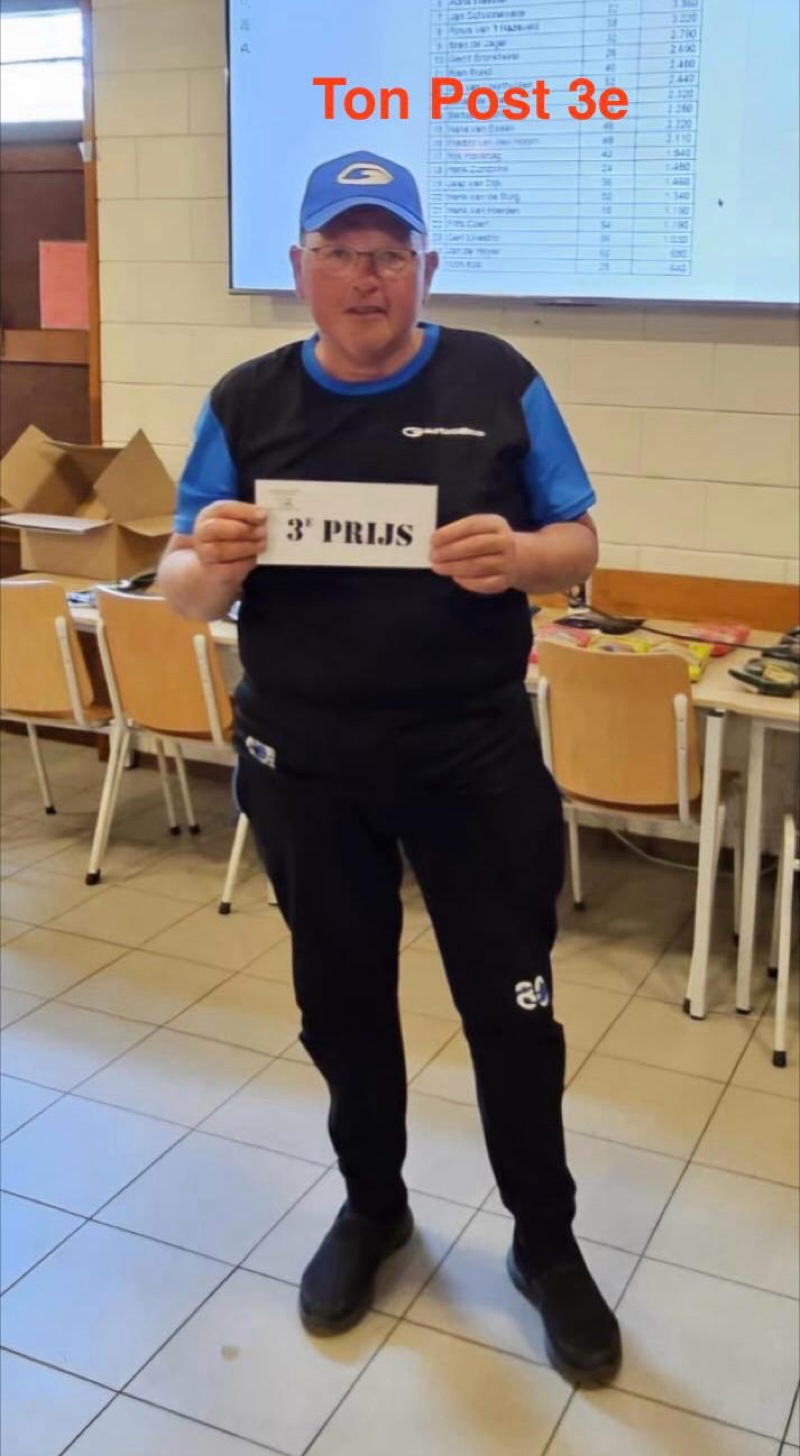 Winnaar werd Marius Jansen met 4.930 gram, tweede werd Will van der Heiden met 4.290 gram, derde werd Ton Post met 4.120 gram. Heren, proficiat met deze uitslag!